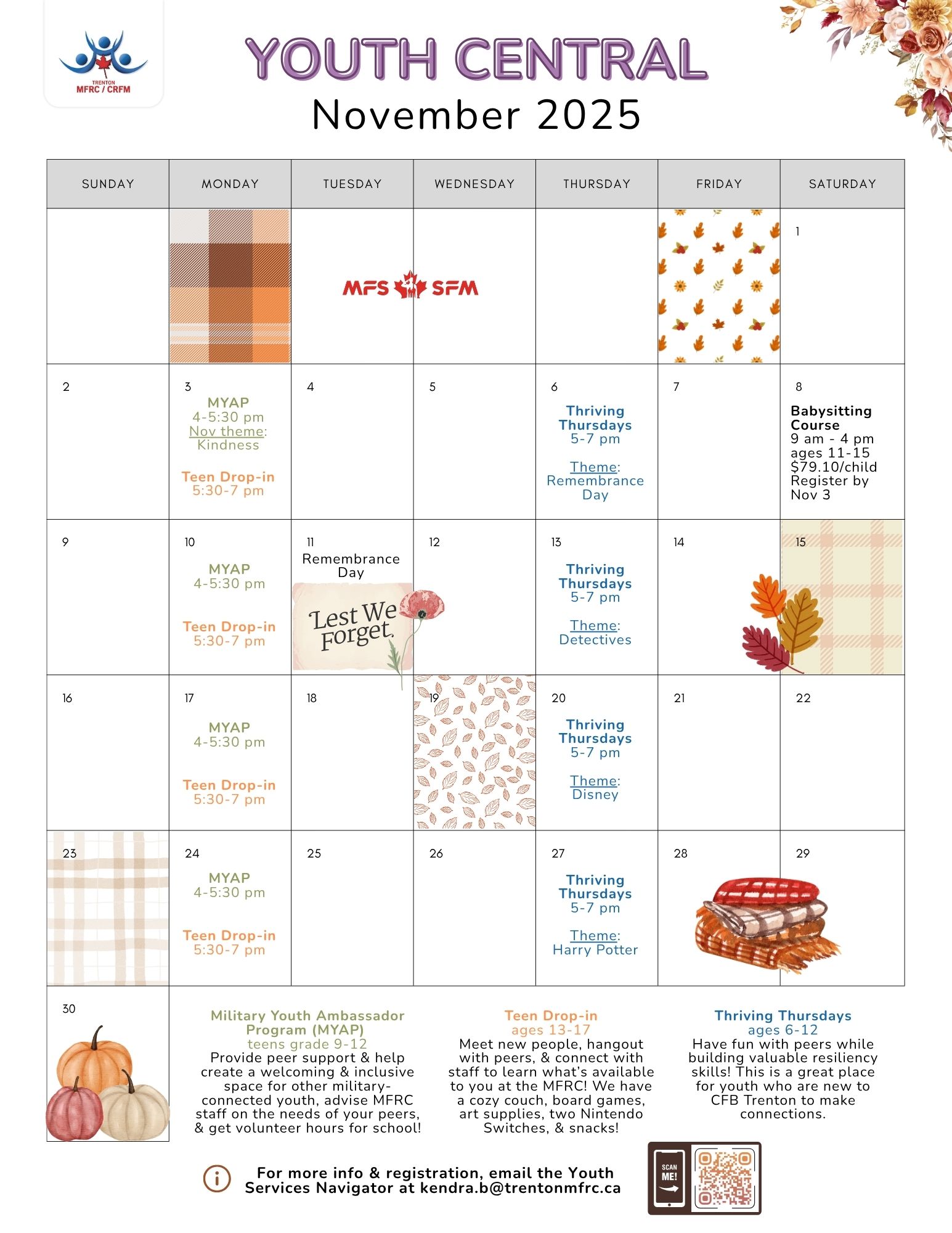 The Youth Services department offers programming to children aged 6 to 18 at our in-house youth center, Youth Central. Activities include game nights, movies, crafts, mindfulness exercises, job readiness workshops, and much more. Other services include Youth Connect, a national Virtual Youth Center; the Military Youth Ambassador Program (MYAP) for teens who want to gain volunteer hours; and Home-Alone Safety and Babysitting courses.